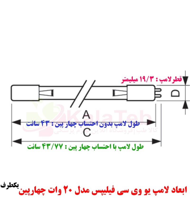 لامپ یو وی سی 20 وات فیلیپس دارای طول 43 سانتی متر بوده و قطر آن 19 میلیمتر است. عمر مفید استفاده از این لامپ فرابنفش تا 11000 ساعت بوده و پس از اتمام این مدت، کارایی لامپ از بین خواهد رفت.طول موج این لامپ UVC در حالت ماکزیمم به 254 نانومتر میرسد.قدرت تابش اشعه یووی در 100 ساعت اول روشنایی لامپ به 6 وات میرسد. این لامپ برای استریل کردن و تصفیه آب و ضدعفونی کردن استفاده میشود.همراه این لامپ،سوکت چهارپین بصورت رایگان وجود دارد.این لامپ UV تصفیه آب از نوع Ozone free بوده و در هنگام استریل کردن گاز اُزُن تولید نمیکند. این لامپ یو وی سی فیلیپس ساخت لهستان بوده و در فروشگاه کالا طب با گارانتی اصالت و سلامت فیزیکی به فروش میرسد.